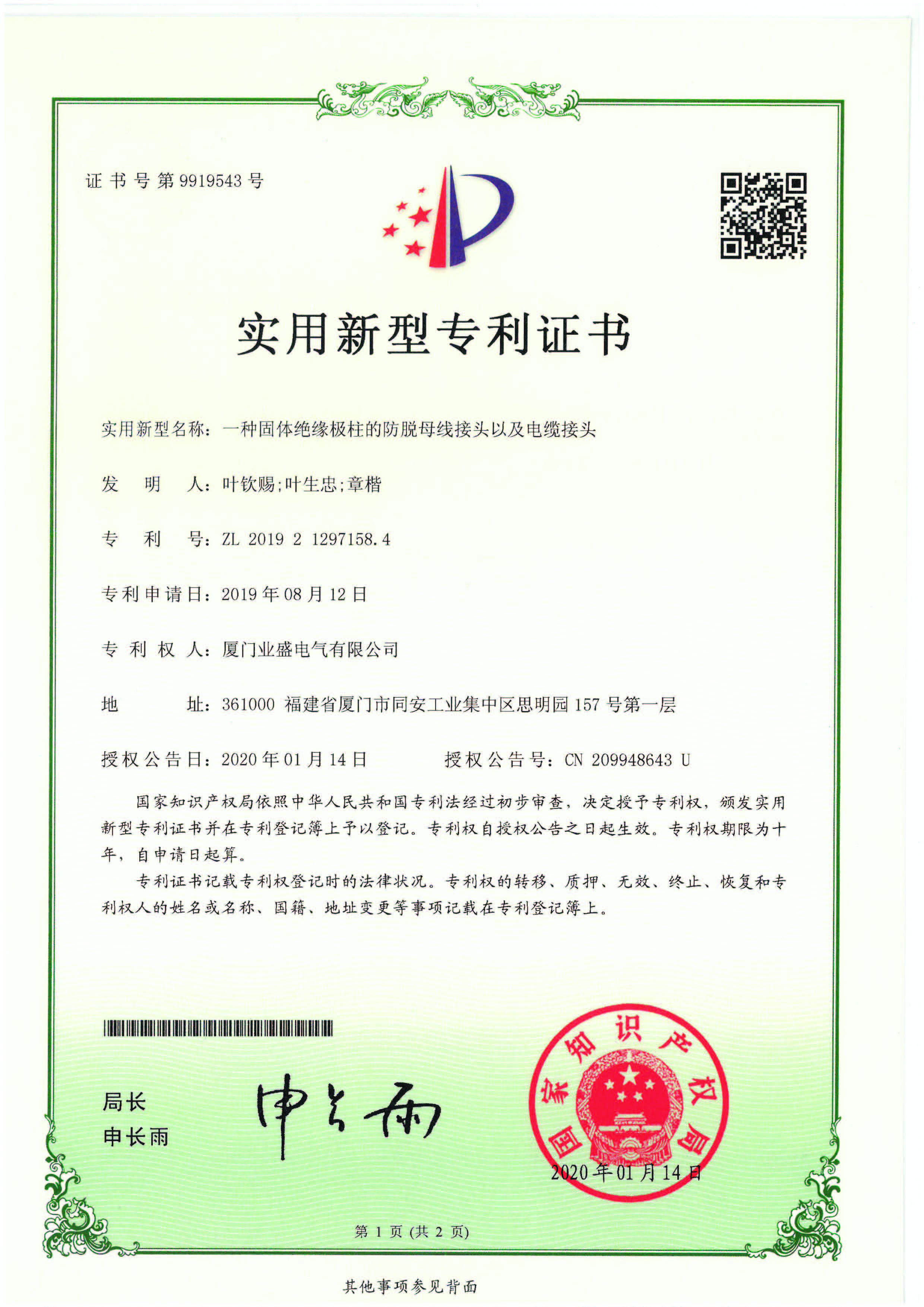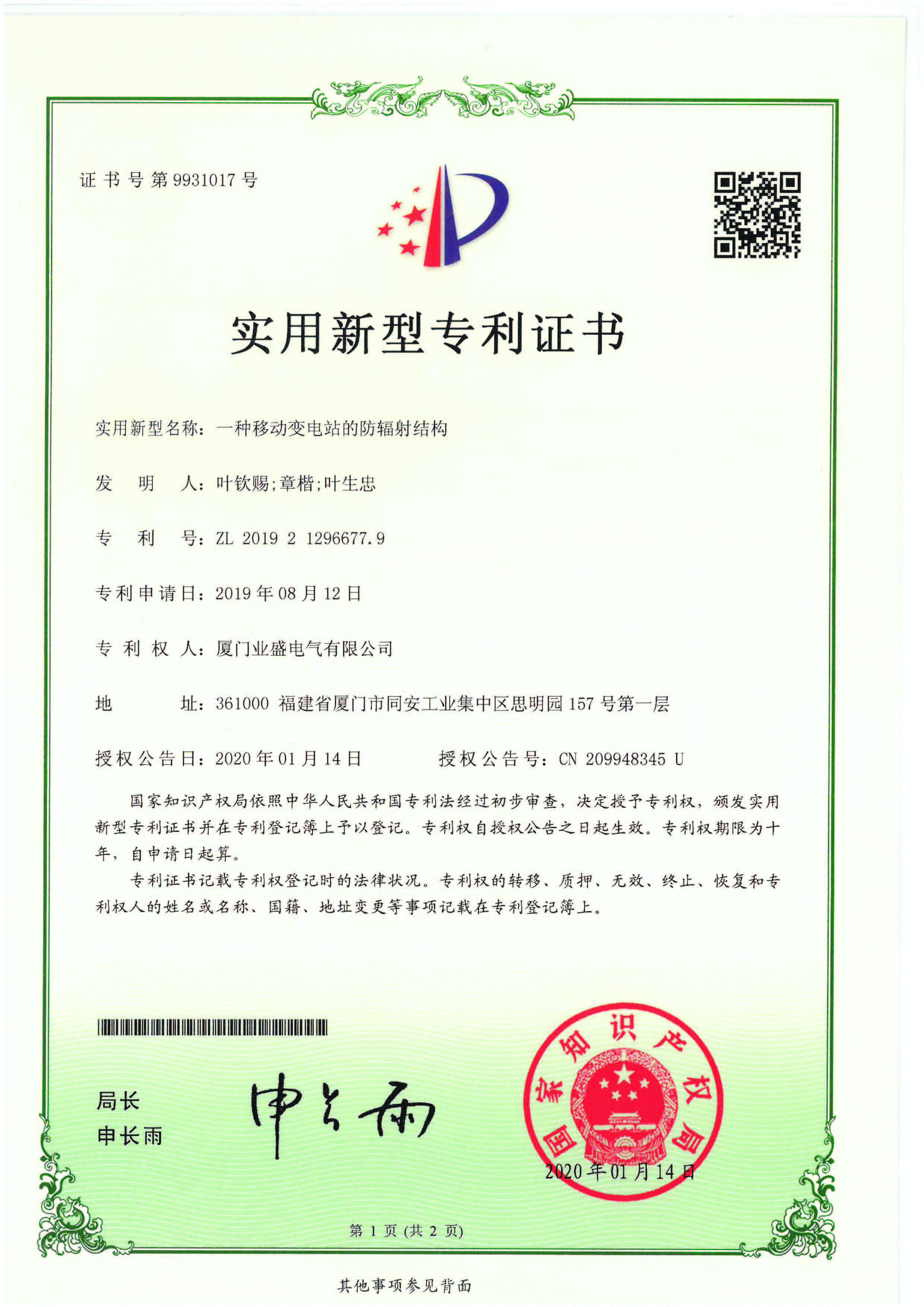 實用新型專利證書